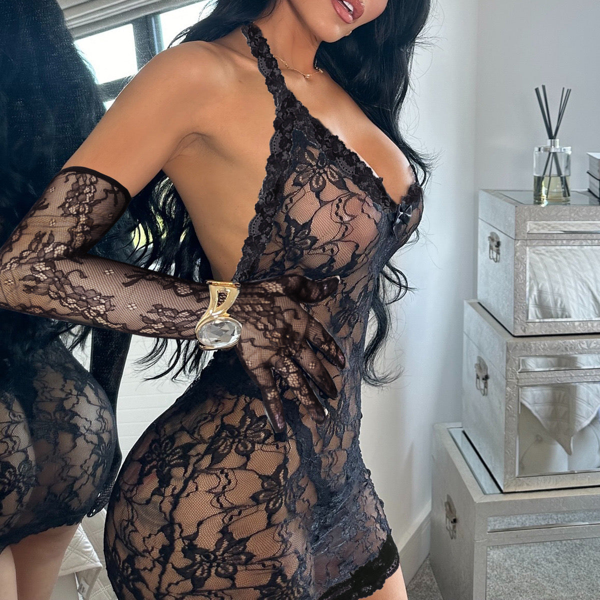 Koronkowy Halter Dress: Głównym elementem jest prześwitujący, koronkowy mini-dress o fasonie halter (wiązany na szyi). Delikatna, ale wytrzymała koronka z kwiatowym motywem subtelnie otula ciało, podkreślając Twoje atuty i dodając tajemniczości. Głęboki dekolt w kształcie litery V, wykończony falbanką, zmysłowo eksponuje biust.