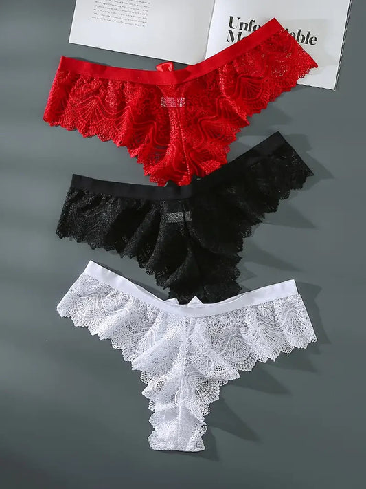 3 Szt. Kwiecistych Koronkowych Figi w Kolorze Białym, Czarnym i Czerwonym!